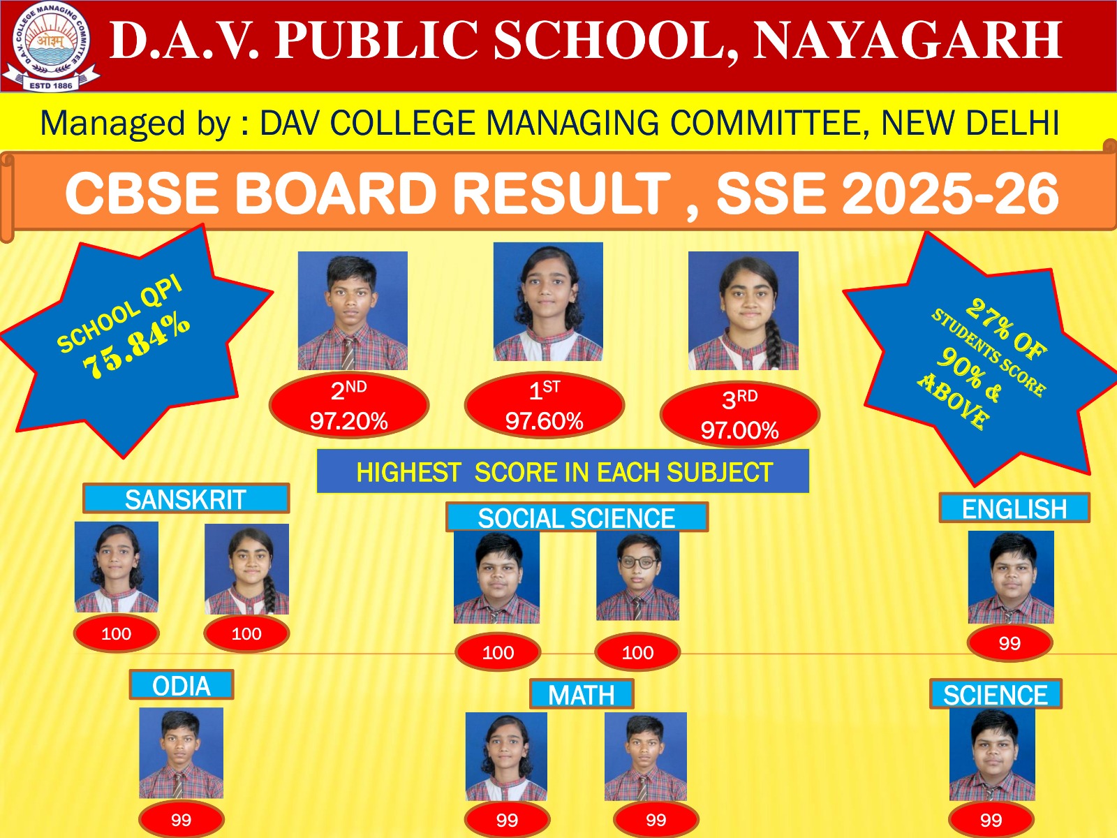 ନୟାଗଡ଼, (ବାଘୁଆବାର୍ତ୍ତା): ଚଳିତ ବର୍ଷର କେନ୍ଦ୍ରୀୟ ଉଚ୍ଚ ମାଧ୍ୟମିକ ପରୀକ୍ଷା ଫଳ ପ୍ରକାଶିତ ହୋଇଛି । ଏଥିରେ ଡ଼ି .ଏ .ଭି ପବ୍ଲିକ୍ ସ୍କୁଲ୍, ନୟାଗଡ଼ର ଛାତ୍ରଛାତ୍ରୀ ମାନେ ଅଭୂତପୂର୍ବ ସଫଳତା ଲାଭ କରିଛନ୍ତି। ସୁଶ୍ରୀ ଲିପ୍ସା ଭାରତୀ ପ୍ରଥମ ସ୍ଥାନ (୯୭.୬ %)ହାସଲ କରି ବିଦ୍ୟାଳୟର ସୁନାମ ଆଣିଛନ୍ତି। ଶ୍ରୀମାନ ଏନ୍ ସାଇ ପ୍ରସାଦ ୯୭.୨ % ରଖି ଦ୍ଵିତୀୟ ଓ ସୁଶ୍ରୀ ଶେଫାଳି ପ୍ରଧାନ ୯୭ % ରଖି ତୃତୀୟ ସ୍ଥାନ ଅଧିକାର କରିଛନ୍ତି। ଚଳତବର୍ଷ ସମୁଦାୟ ୩୦ ଜଣ ଛାତ୍ରଛାତ୍ରୀଙ୍କ ମଧ୍ୟରୁ ୮ ଜଣ ୯୦% ରୁ ଅଧିକ ଓ ୨୨ ଜଣ ୬୦% ରୁ ଅଧିକ ନମ୍ବର ରଖି ପାସ୍ କରିଛନ୍ତି। ଏହି ସଫଳତା ପାଇଁ ବିଦ୍ୟାଳୟର ପ୍ରଧାନଶିକ୍ଷକ ଶ୍ରୀଯୁକ୍ତ ସରୋଜ କୁମାର ମିଶ୍ର ଛାତ୍ରଛାତ୍ରୀମାନଙ୍କୁ ଧନ୍ୟବାଦ ଅର୍ପଣ କରିଛନ୍ତି। ଏବଂ ଡ଼ି.ଏ.ଭି ପବ୍ଲିକ୍ ସ୍କୁଲ୍, ନୟାଗଡ଼ର ଶିକ୍ଷକ ଓ ଶିକ୍ଷୟିତ୍ରୀ ମାନଙ୍କ ପରିଶ୍ରମ ଓ ପ୍ରେରଣା ପାଇଁ ସାଧୁବାଦ ଜଣାଇଛନ୍ତି।